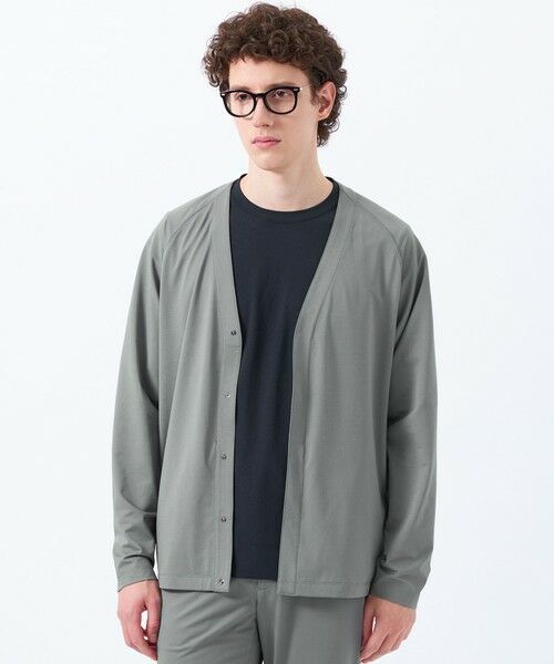 スタイリッシュなV開きタイプのカーディガンです。腰ポケット付のラグランスリーブデザインで軽快な着心地が特徴。パンツはスポーティ仕様のカジュアルパンツ。ベルトもできるようにベルトループを付けています。共にウォッシャブル・吸水速乾仕様。
