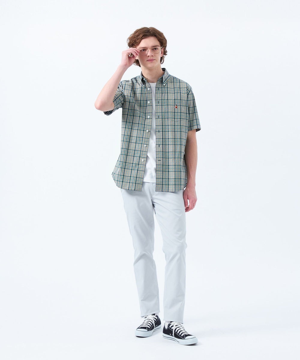 胸元のBEARワッペンがポイントの柄物半袖ボタンダウンシャツ。夏向けの清涼感ある素材を使用しているため快適に着用いただけます。ウェスト後ろゴム仕様のエラスティックパンツ。ベルトなしでも穿けるリラックスした穿き心地。ON/OFF兼用で使えるパンツです。