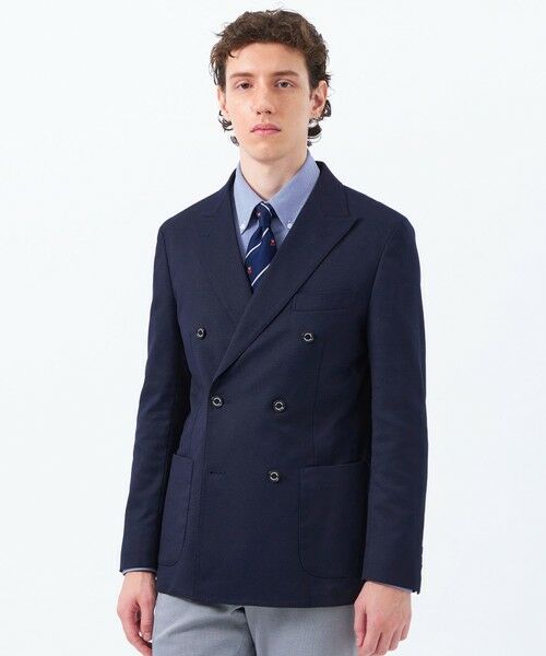 6つボタンのダブルブレザージャケット。腰パッチポケットで、内仕様は大見返しの背抜き仕立て。左右に内ポケットが付き、袖裏はメッシュ素材です。