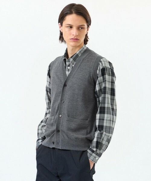 着こなしの幅が広がる前開きニットベスト【デザイン】ボタンフロント仕様のVネックニットベストです。カジュアルな着こなしはもちろん、ジャケットのインナーに合わせてVゾーンの高さや身幅を調整していますのでビジネススタイルにもおすすめです。寒暖差のある気候にとても重宝するアイテムです。【素材】ウォッシャブル対応加工が施されたウール糸を使い編み上げたハイゲージニット。細い繊維を使用しているため、程よい光沢感があり、素肌にやさしくフィットするクセのない着心地が特徴です。紡績する前のワタの段階で特殊なトリートメント(防縮加工)をしているため、毛羽の少ないクリアな表面感になっています。【機能性】ウォッシャブルおすすめ着用期間:秋/冬※この商品はサンプルでの撮影を行っています。実際の商品とイメージ、仕様が異なる場合がございます。