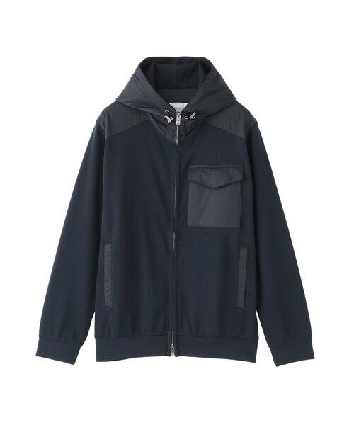 布帛とニットのコンビネーション使いがアクセントになったフーデッドパーカー