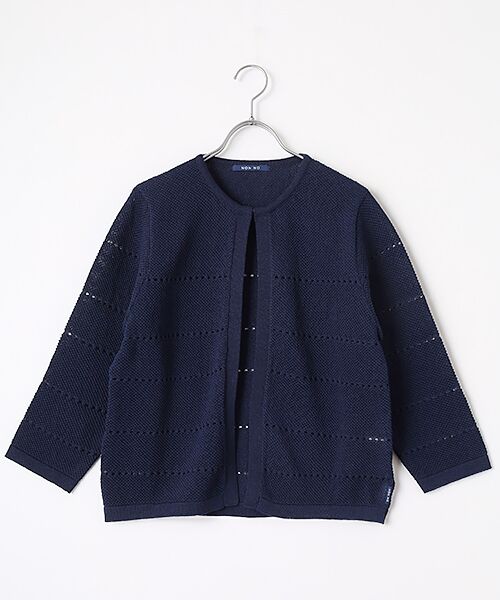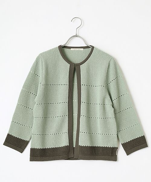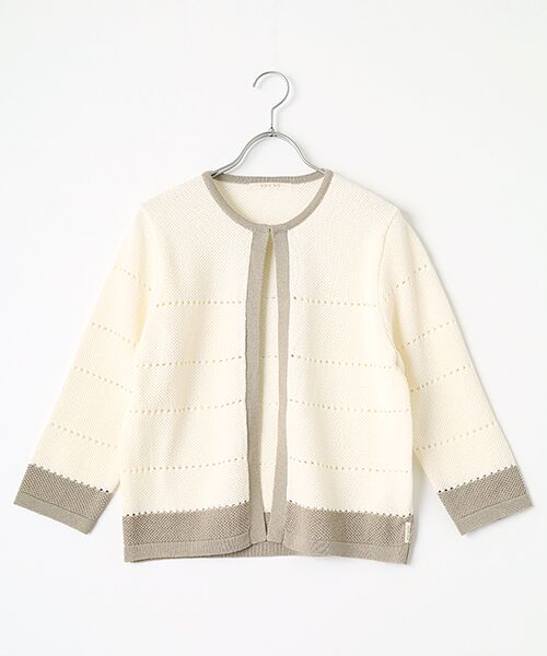 アイレットボーダーの編地が清涼感ある印象にしてくれるカーディガン。