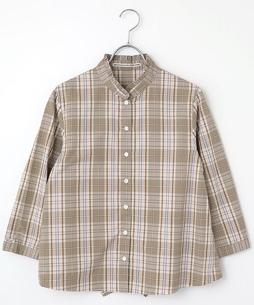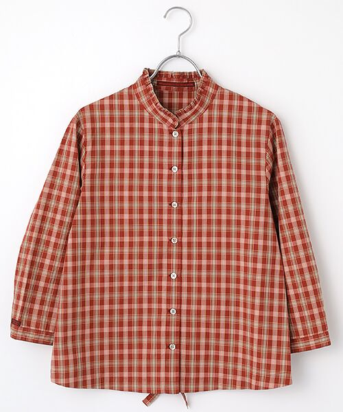 人気のスタンドフリル衿デザインのチェック柄ブラウス。