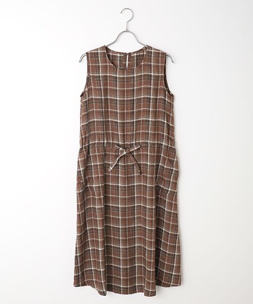 リネン100%素材を使用したチェック柄ワンピース。インにTシャツをいれてカジュアルに、カーディガンを羽織ってきれいめに、それぞれコーディネートをお楽しみいただける1枚です。~生地~44/1リネンをタテ糸・ヨコ糸に使用したポプリン組織の素材です。リネン100%を使用していますので、特有の良さをストレートに感じられる素材です。染色は全て特殊染色のルポワン染を施しています。この染色はリネン糸の表面のみに染色することで、中白とムラ感、フェード感が表現出来ます。ルポワン染と各柄の組み合わせによる柄表現は他の染工場では表現出来ない組み合わせです。仕上げ加工では、リネンを最大限活かすCC加工をゆっくりと施しソフトで反撥感のある風合いに仕上げました。※裏無し※後1ッ釦明き※ノーカラー※ノースリーブ※両脇スラッシュポケット※ウエストに共紐入り
