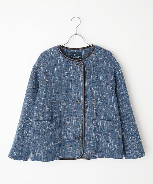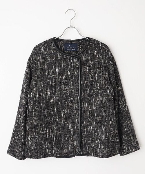 ツィードにクールな印象の牛革トリミングで、大人リッチな雰囲気のノーカラーブルゾン。ドロップショルダーでカジュアルな印象ながらも、全体的に上品な印象にまとまります。どんなアイテムとも合わせやすく、おすすめのコートです。同素材を使用したステンカラーショートコートもございます。~生地~タテ、ヨコ糸共にSUPER140’Sウールにコットンスラブ糸を2本巻き付けた三つ撚り杢糸をベースにしたドビー組織ツイードです。ハイクオリティーなウールに動きのあるコットンスラブ糸を撚糸する事で特徴的なカラー表現となっています。織り組織にドビー織りを組合せる事で、よりやわらかで膨らみのある立体的な仕上がりのこの素材は、糸・撚り・織りと三位一体の拘りがつまったツィード素材です。※レザートリム※ノーカラー※長袖※ドロップショルダー※前釦開き※前端~衿にレザートリミングテープ(牛革)※パッチポケット※総裏