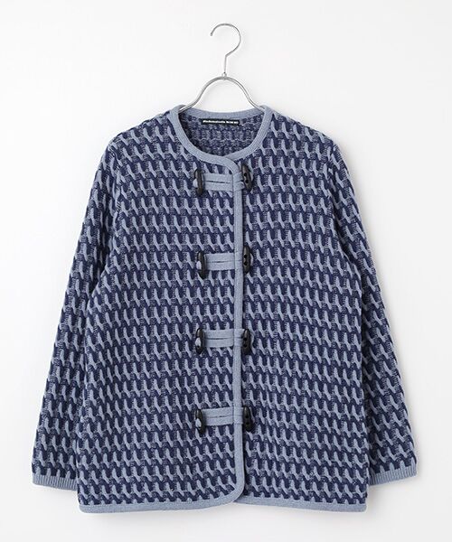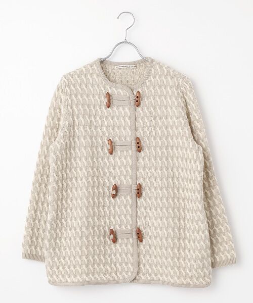 トグル釦デザインが目を惹くニットコート。2色使いのケーブル編みが立体感を生み、より華やかな印象です。同素材を使用したケーブルセーターもございます。