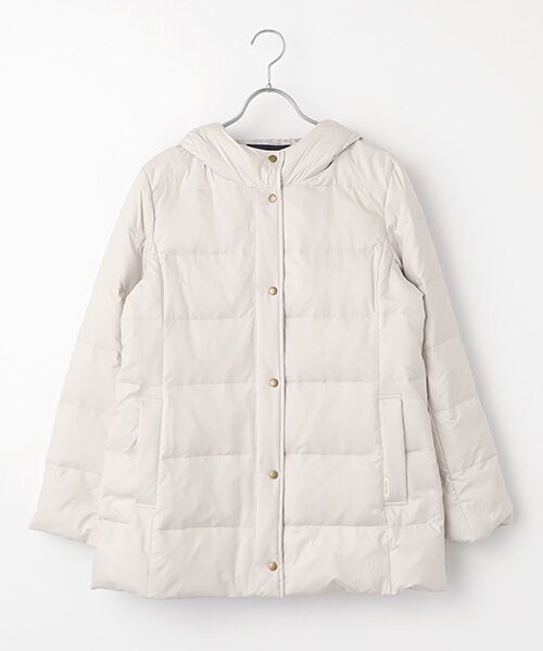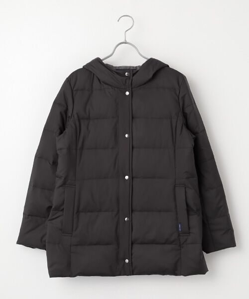 お尻が隠れる丈で後ろラウンドヘムデザインのダウンコート。顔周りにボリュームのある変形フードや、ダウンのふわふわ感がフェミニンな印象を演出します。ほんのりウエストをシェイプし、ゆったりとした着心地ながらカジュアル過ぎず、キレイめな印象でお召しいただけます。~生地~タテ・ヨコ糸ともに40Dのリサイクルポリエステルを使用したタフタ素材です。裏シレー加工を施していますが、ポリエステルマイクロファイバーを使用しているため、非常にソフトでエアリアルな風合いが特徴のアウター素材となっています。※長袖※前ドット釦+ファスナーあき※切り替え利用ポケット※ヘム後ろ下がり(前が少し短い)※左袖に織ネーム付き