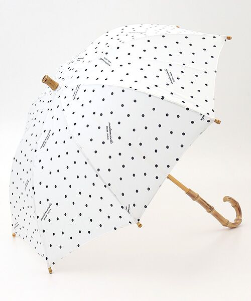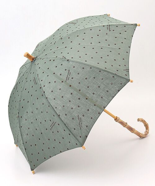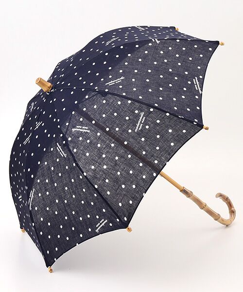 ドット柄リボンが涼し気な日傘。手捺染プリント素材を使用しています。~生地~下生地は、リネンの原料の中で最高ランクであるベルギー近辺の大変貴重な原料を使用したリネン本来の清涼感、高級感のある素材です。1950年代から60年代をイメージした水玉をシンプルに正円をフリータッチで描き、バランス良く描きました。『mademoiselle nonnon』のロゴをポイントに入れたクラシックで洗練された水玉柄です。こちらは手捺染プリントです。※親骨:47cm×8本※UV・弱撥水加工