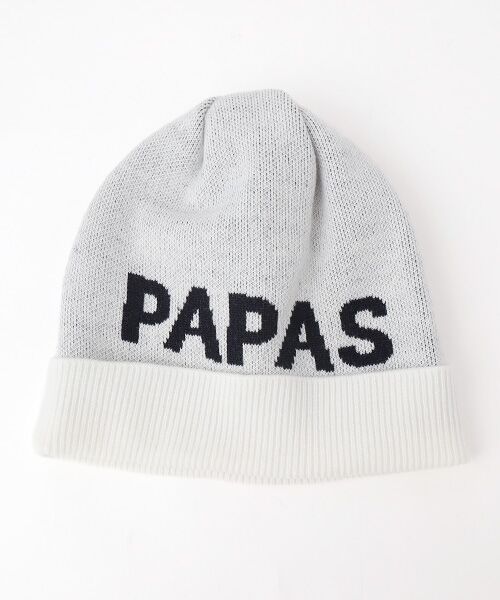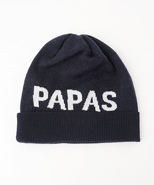 カジュアルなロゴ入りニット帽。スポーツシーンにもおすすめです。※ダブルジャガードニット※折り返し部分:リブ編み※左・右 ロゴ(PAPAS)柄配色