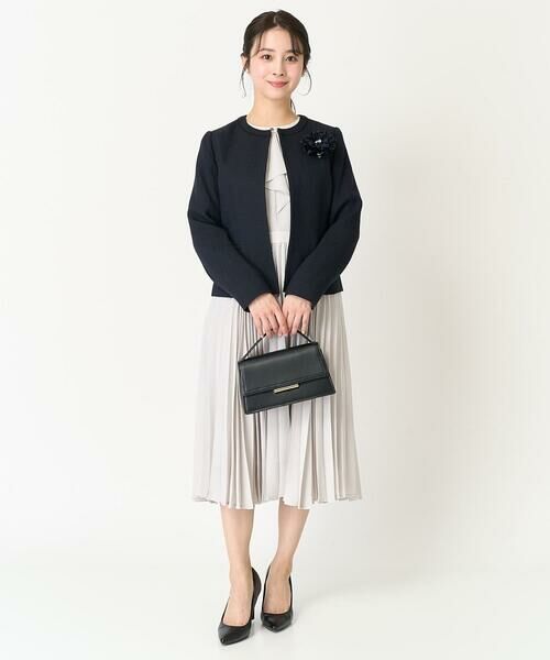 一枚でも着映えするワンピース。ハレの日から普段使いまでぴったりなワンピースは、スカート部分はプリーツを施し、やわらかく流れるシルエットに仕上げました。袖口はアクセントにメタル釦を使用。ブラウス部分はボウタイのデザインなのでジャケットとの合わせも素敵に着こなせます。