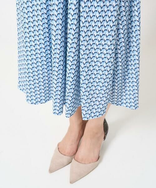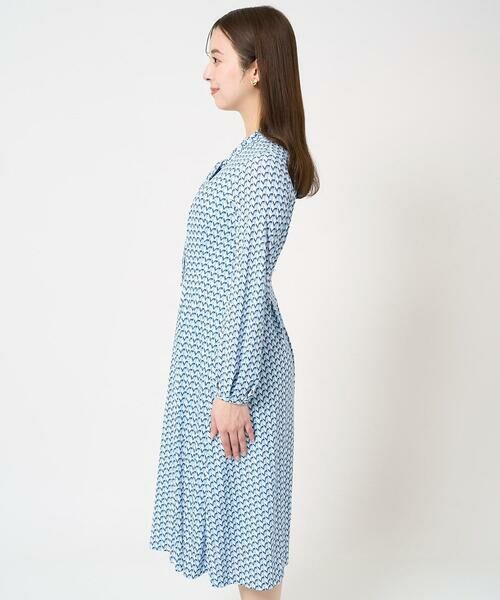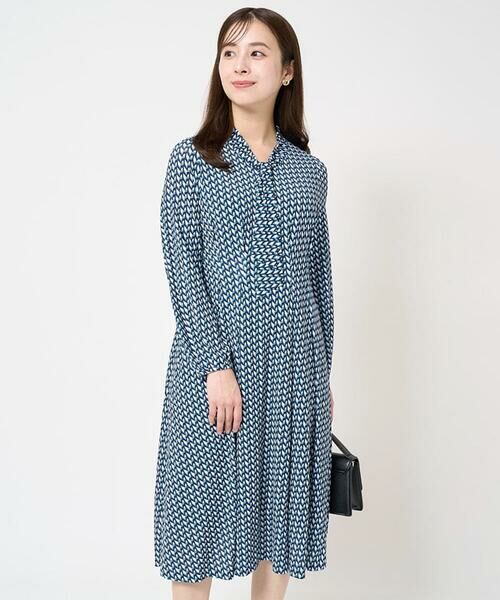 毎日の通勤にもマッチする落ち着いた雰囲気の総柄プリントワンピース。優しいトーンのライトブルーと、コントラストが映えるネイビーの二色展開。ウエストから上下に入ったタックがシルエットをきれいに見せながら、着心地の良さも兼ね備えた一枚です。胸元のボウタイは引っかけて垂らすだけで、テクニック要らずで素敵に決まります。