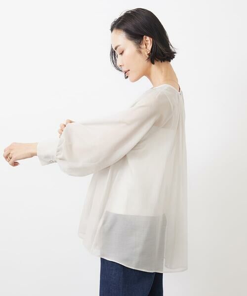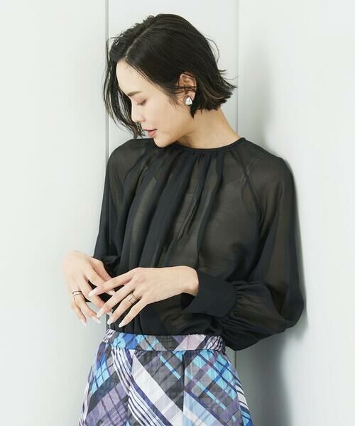 素材の特性を活かしたシアーブラウス。インでもアウトでも着られるレングス設定です。ボリュームのあるパフスリーブも前はすっきり、後ろにボリュームを持たせることで横から見た時も袖が太すぎずフェミニンな印象に仕上がっています。