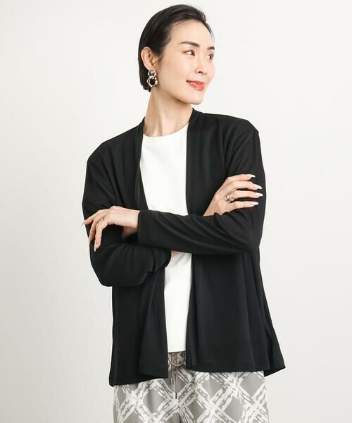 ヒップにかかる安心の丈感と、ドレープがきれいなシンプルで飽きのこない着流しカーディガン。