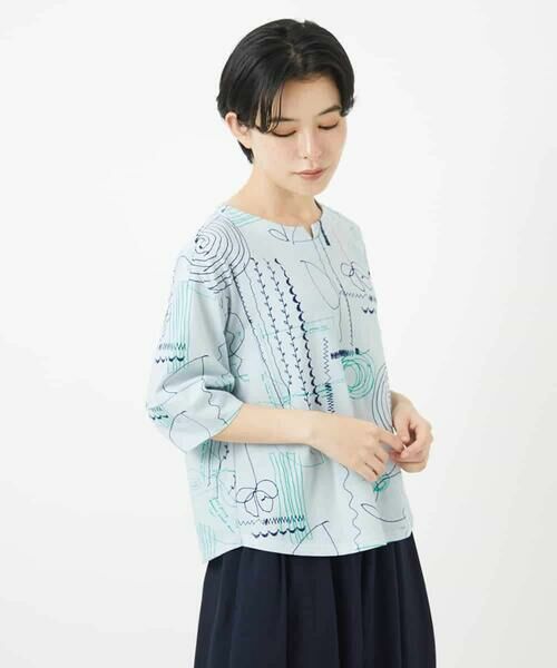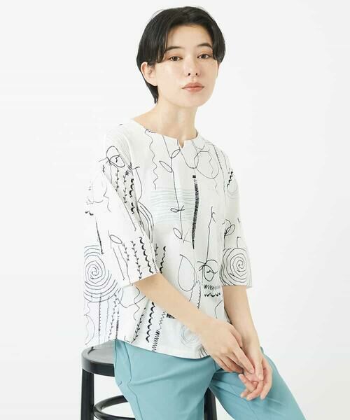 キーネックの襟ぐりは、見返し始末でカジュアルすぎない印象に。 あえて立体的に作った袖は華やかさをプラス。ブラウス見えするカットソーは、ラウンドした裾デザインで、スカートにもパンツでもボトムを選びません。