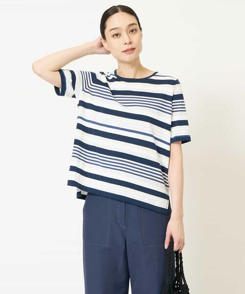 上品な風合いと光沢のマルチボーダーが魅力。 細番手の高級綿を強撚することでシャリ感と光沢感がある素材を使用。