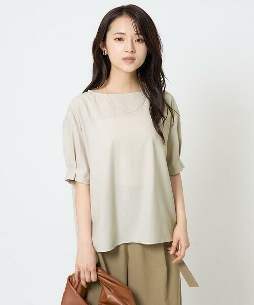 袖口にタックを取り袖コンシャスに仕上げたシンプルなブラウス。着丈に前後差を付けたデザインは、ボトムにインでもアウトでも決まりやすい。肘が見え隠れする五分袖に体のラインを拾わない程よいシルエットはシーズン問わず快適に着こなせます。