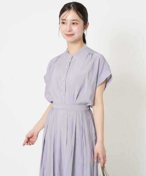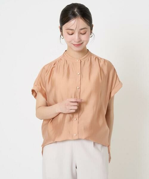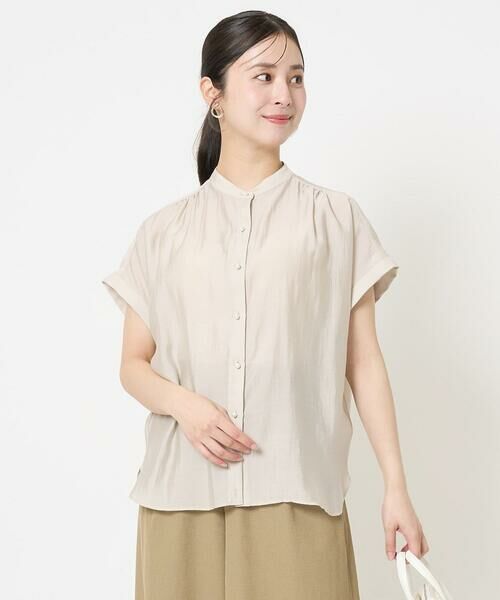 首周りをすっきりときれいに見せるバンドカラーのブラウス。前開きのシャツ型タイプで、きれいめになりすぎずカジュアルスタイリングにも◎。小さなパール調釦使いもポイント。肩に少しギャザーを入れ、ふんわりと立体感のあるシルエットに仕上げました。裾を内側の釦で留めるとウエストインしたようなシルエットでも着こなせます。