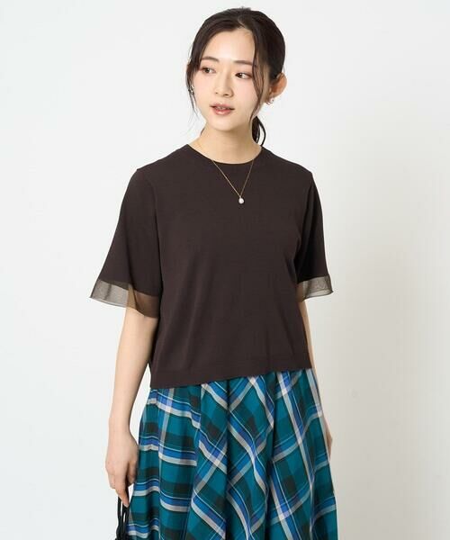 袖口を同色系のシアー糸で編み立てたクロップド丈のニットプルオーバー。品良くきれいめなTシャツ感覚で使え、アクセサリーにも映えるシンプルなデザインです。