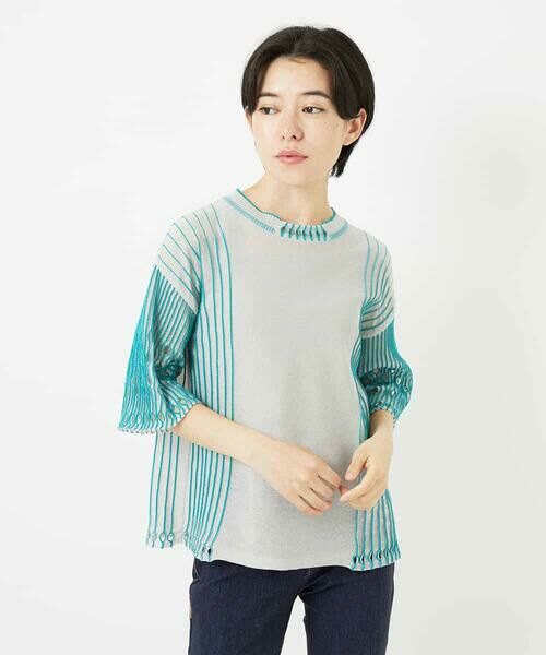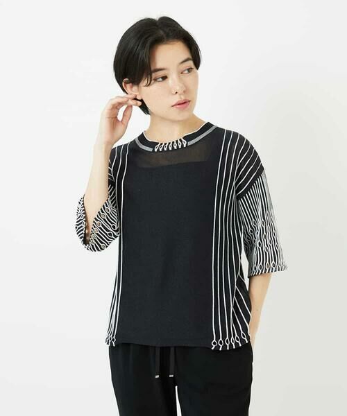 凹凸のある配色ラインとホールアクセントをふんだんに織り交ぜたレーシーな編地が特徴的な一枚。さらりとした清涼感のある軽いお作りで機能面にも優れた特別感あるデザインです。柄入れをサイドに施した細見えシルエットで楽な着心地も嬉しいポイント。大人カジュアルに一枚さらりと合わせて頂ける今季注目のアイテムです。