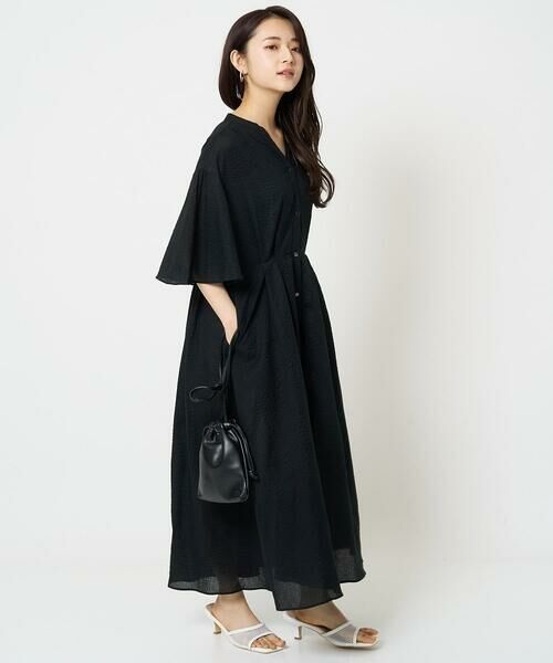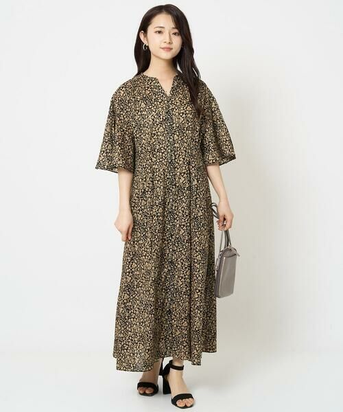 長めの袖丈で気になる二の腕や肘までカバーしてくれるワンピース。ウエストに切り替えが入っているので、楽な着心地ながらも1枚できれいなシルエットが叶います。キーネックの衿元も女性らしい印象に。前釦タイプなので着脱も簡単です。