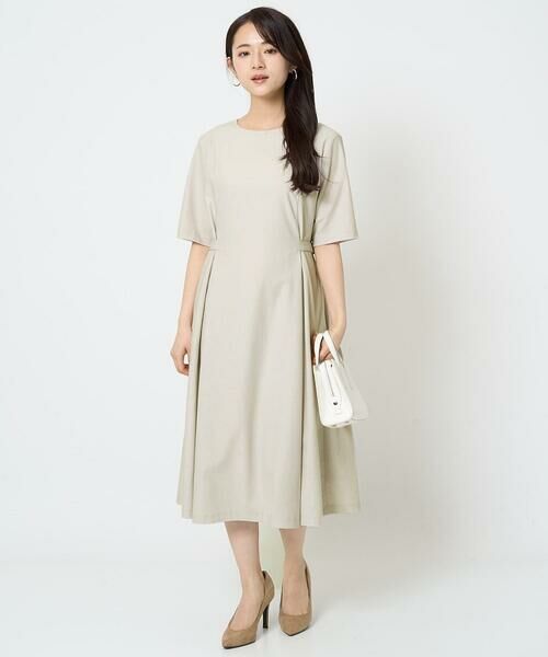 タイトな衿ぐりとウエストのサイドに付いたベルトを高めにすることで、きちんとした印象に仕上げたワンピース。ウエスト上から入ったタックで身体のラインを拾わずきれい見えを叶えてくれます。長めの袖丈で気になる二の腕もカバー。