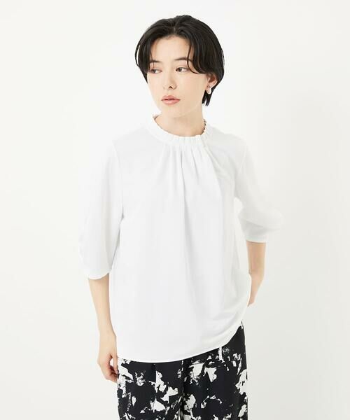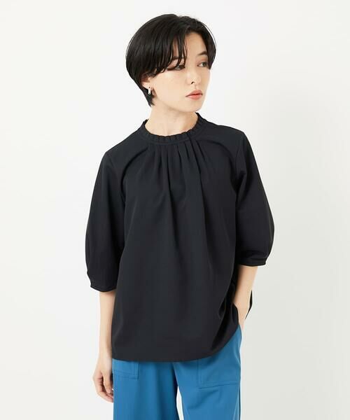 低めのタックフリル襟が上品な印象のストレッチ素材のブラウソー。プルオーバー見えしますが、前側にボタンがあり首元が大きく開くので着脱もしやすいです。袖口にボックスタックを入れ、やや膨らみを持たせた大人フェミンなお袖もポイントです。初夏のおでかけにもおすすめのきれいめなデザインです。