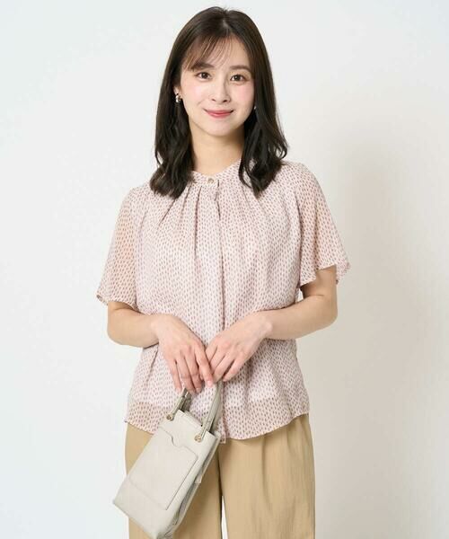 大小のスクエア柄がドット調に並んだ上品なプリントブラウス。艶消しのゴールド釦が衿元を華やか。着脱もしやすい前スリット使用です。衿元のタックとフレアスリーブで涼しく快適な着心地。
