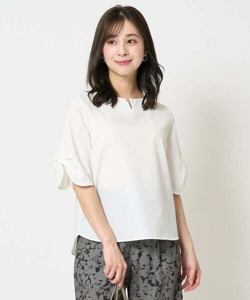 ふんわりとした袖のボリュームとタックデザインがポイントのブラウス。衿ぐりはデコルテをきれいに見せてくれるキーネックデザインで程よい抜け感をプラスしました。