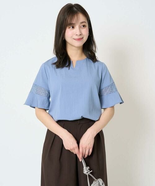同色レースを袖に挟み込んだフレアースリーブのブラウス。程よいフレアー感とセットインスリーブできれいめにも着こなしやすいデザインに。接触冷感の素材で涼しく着こなせて、UVカット機能も付いているので日差しが気になる時期も快適に過ごせます。
