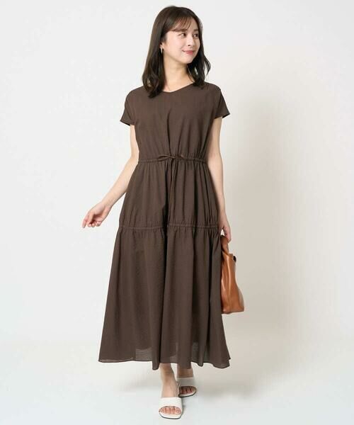 ウエストのリボンをきゅっと絞れば、メリハリのあるシルエットでラクな着心地ながらもすっきりとした印象に。切り替え位置もやや高めなのでスニーカーなどフラットシューズともバランス良く着こなせます。