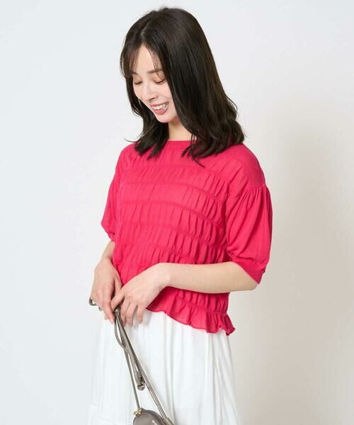 ややシアー感のある薄手素材が涼しげな印象のサマーニット。シャーリングデザインがすっきり見えを叶えながら体のラインを拾いすぎず着こなしやすいシルエットが嬉しい。甘くなりすぎないドロップショルダーデザインで仕上げました。