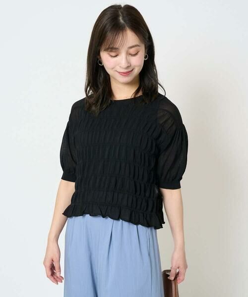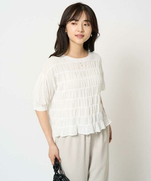 やや短めの着丈はワイドパンツやスカートなどボリュームのあるボトムにインしなくてもバランス良く着こなせます。二の腕がしっかりと隠れる袖丈ですが、ほんのりシアー感があるので涼しげに着こなせるのも嬉しい。ホワイトとブラックは同素材のカーディガン【F1SHA61130】もご用意しているのでアンサンブルとしても着用可能です。