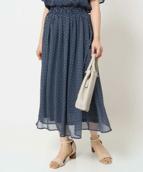 大小のスクエア柄がドット調に並んだ上品なプリントのシフォンスカート。落ち感がある素材は広がりすぎないので甘くなりすぎず大人っぽく着こなせます。ウエストゴムでストレスフリーな着心地も嬉しい。