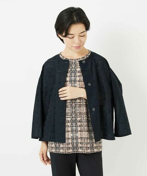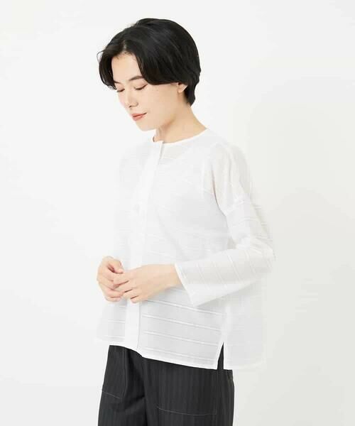 ストライプ柄のカラミ素材をヨコ使いでボーダー柄にしたノーカラーブラウス。