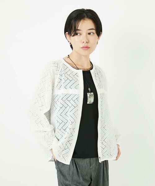 薄いコットンローンに刺繍を施した羽織ブラウスです。センターフロントはファスナー開きでブルゾン風に仕上げています。スカートやワンピースに合わせやすい、ややショートな丈感です。ファスナー仕様なので着脱が楽ちんで、冷房や日よけ対策におすすめしたい一着です。とても軽量で透け感のあるデザインなので見た目も着心地も涼やかなアイテムです。