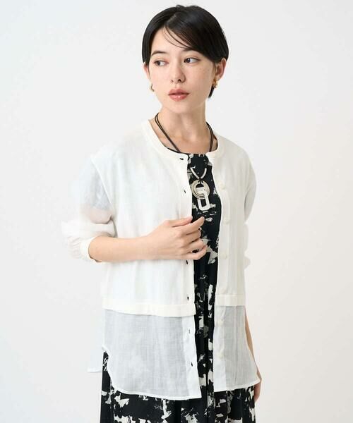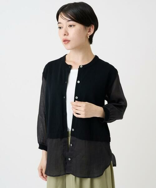 異素材の組み合わせが目を引く大人のための軽やかなカーディガン。シアー感のある袖と裾が、コーディネートに抜け感と上品なニュアンスをプラス。ラウンドヘムの切り替えデザインが動きに表情を与え、羽織るだけでこなれた印象に。シャツライクなデザインで、インナーにタンクトップを合わせてすっきり見せても、ワンピースの上にさらっと羽織っても◎。季節の変わり目や冷房対策にも重宝する、実用性とおしゃれ心を兼ね備えた一枚です。