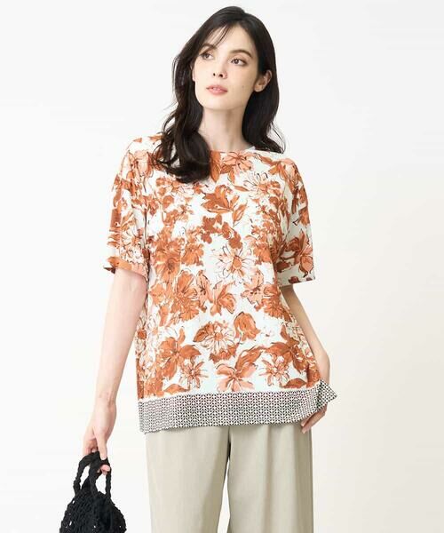 優しい花柄とレトロ感あふれるジオメトリックパターンを組み合わせた装飾性の高いプリント柄