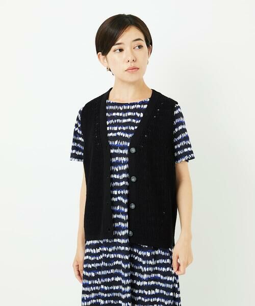 片畦編のコンパクトなニットベストです。ギマのようなドライタッチ素材を使用しているので、汗ばむ季節でも涼しく着用いただけます。ざっくりした片畦編に大きめのアイレットがアクセントになっています。風通しがよく、暑い日も快適にレイヤードスタイルを楽しめます。