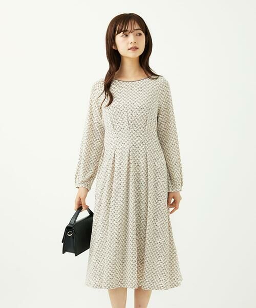 Maison de CINQ / メゾン ドゥ サンク ロング・マキシ丈ワンピース | 【小さいサイズ】タックデザイン幾何柄ワンピース/洗濯機で洗える(アイボリー)