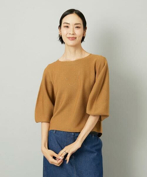 繊細なラメが上品にきらめく、ハリ感のある編地。ホールガーメントならではの縫い目のない仕立てで、美しいフォルムをキープしつつ立体的なパフスリーブを際立たせました。一枚で着映えするニットです。