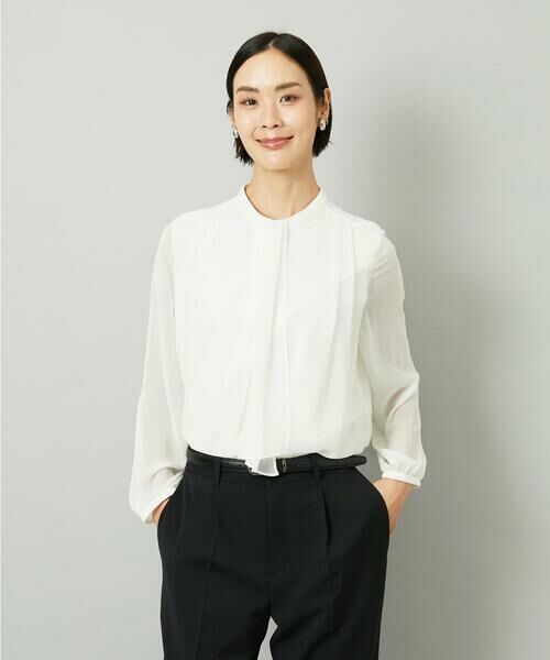 フェミニンさと上品さを兼ねそろえた大人ブラウソ—。一枚着はもちろん、ジャケットのインナーとしてもボウタイが華やかな印象を叶えます。ボウタイが取り外し可能なため、合わせるアイテムで衿元の雰囲気が変えられるのも嬉しいポイント。お出かけ着やオンスタイルのインナーとしても重宝するアイテム。