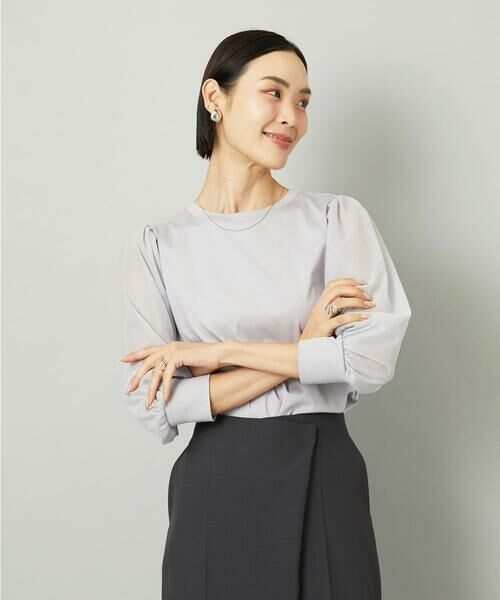 袖にあしらったラメチュールが、上品なきらめきを添えます。オフィススタイルはもちろん、スカートでフェミニンに、パンツでシャープにと幅広く活躍。七分袖デザインで、季節の変わり目にも快適に着られる万能トップスです。