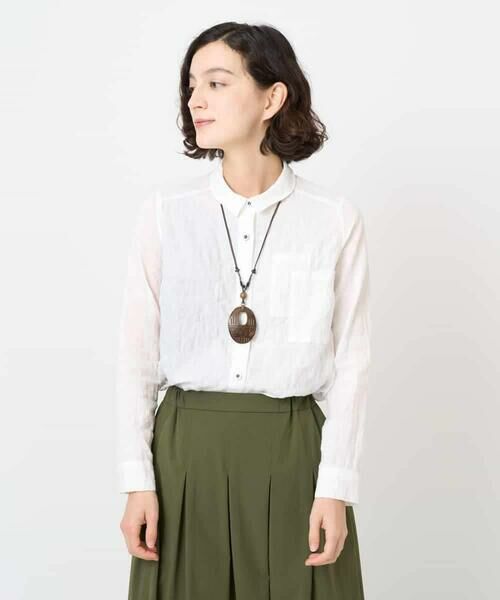 ジャンニ ロ ジュディチェで定評のブラウスデザインにシャーリング素材にのせて、リラクシーで柔らかな印象に仕上げました。小さめのシャツカラーは、ニットなどのインナーから羽織ブラウスとしても着合わせしやすいデザインです。左胸にはWポケットでアクセントつけて大人かわいいデザインに仕上げました。