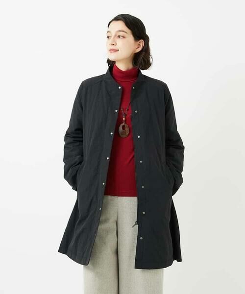 ダウンコートには見えないスマートなダウンコート。総裏仕様で、部分的にセットしているダウンは分量と配置にこだわり、着ぶくれしないすっきりシルエットのダウンコートです。分厚くないから首周りもすっきりとしたコンパクトな変形スタンドカラーのデザイン。ストールやティペットも巻きやすいです。ほんのりAラインシルエット。後身頃のウエスト内側のドロストを絞るとソフトにウエストマークしたシルエットでお召しいただけます。附属のフードを付ければカジュアル感が出て違う雰囲気でコーデを楽しめます。春先のまだ寒い時季にも活躍するアイテムです!