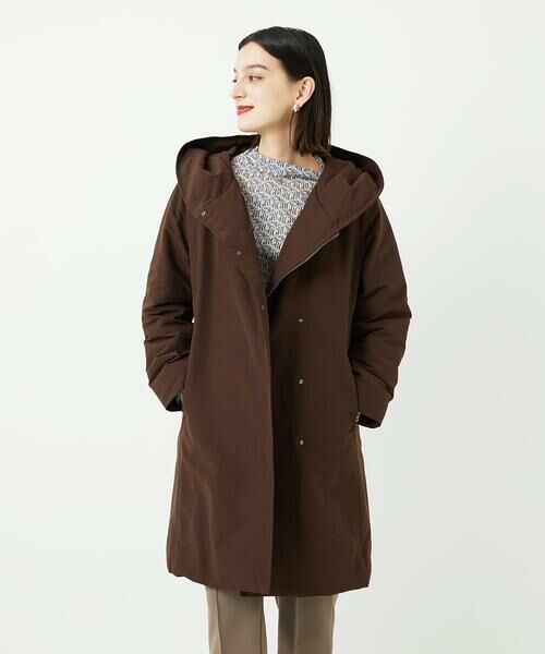 大きめフードがアクセントのステッチレスダウンコートはとても軽量でストレスフリーな着用感です。第一釦を開けてフードを外側に折り返せば、ボリュームあるショールカラー風にも変化をつけていただけます。釦は小さめの隠しドットボタンを使用し、前を締めても前開きで軽く羽織ってもサマになる一着です。内側はファスナー仕様にすることで、風を通さずに暖かく着用いただけます。ほどよい分量のダウンを入れており、着膨れせずにすっきり羽織れるダウンコートになっております。表面をステッチレスにしているので、カジュアルになりがちなダウンコートをきれいめに着こなしていただけます。
