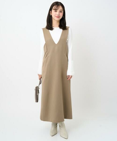 シャープなVネック、すっきりとしたIラインシルエットがきれいなジャンパースカート。ウエスト位置が高く見えるように仕上げたデザインです。アーム部分も広く開いたデザインなので、合わせるインナーを選ばないのも嬉しい。