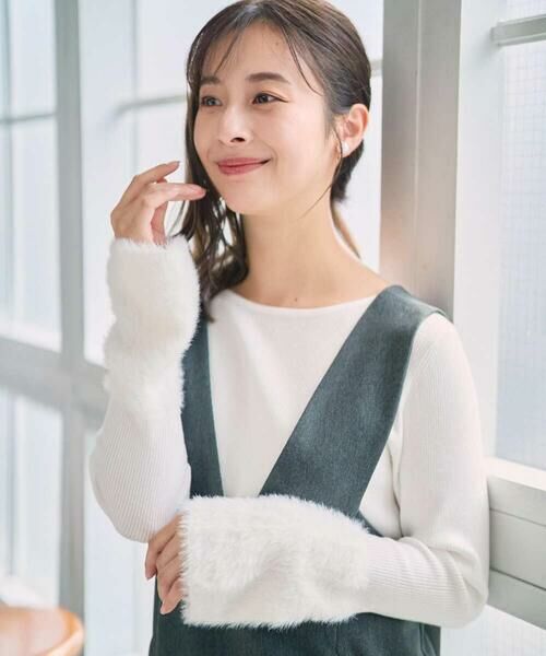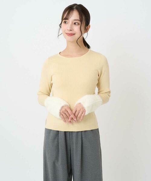 身頃はシンプルなリブ編地、袖口部分は毛足のあるフェザー素材のバランスが大人可愛い雰囲気に。