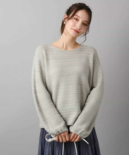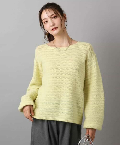 すっきりと見える襟ぐりと袖口のボリュームパフがデザインポイントのニット。編地でボーダーを表現したニットは手持ちにはない、買い足しアイテムとしてもおすすめです。