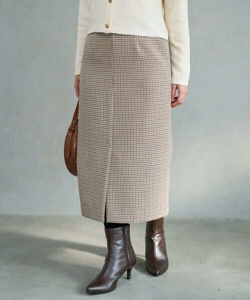 フロントにスリットの入ったデザインのIラインシルエットのスカート。抜け感があり、足さばきの良いデザインです。シンプルなラインがすっきり見えします。ガンクラブチェックの柄もそこまで主張しすぎず馴染み良し。