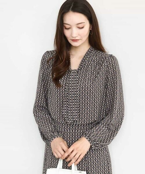 Maison de CINQ / メゾン ドゥ サンク カットソー | 【小さいサイズ】スクエア幾何柄ボウタイカットソー/洗濯機で洗える(ダークブラウン)
